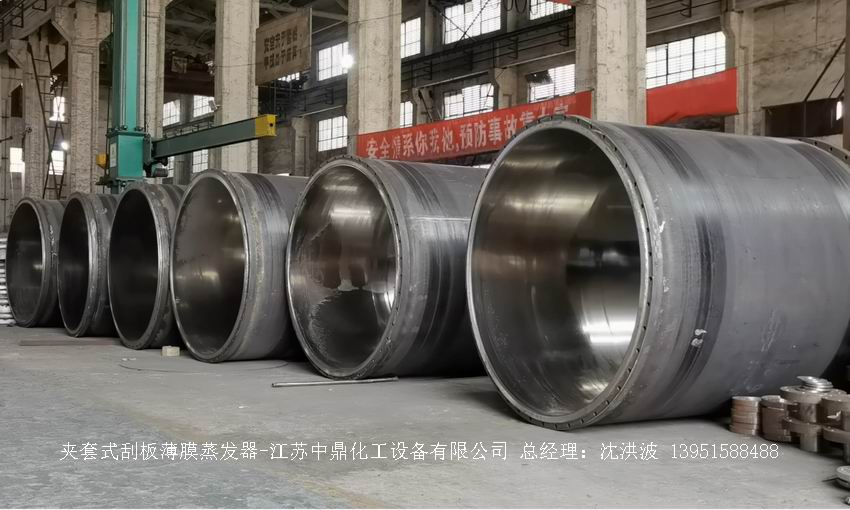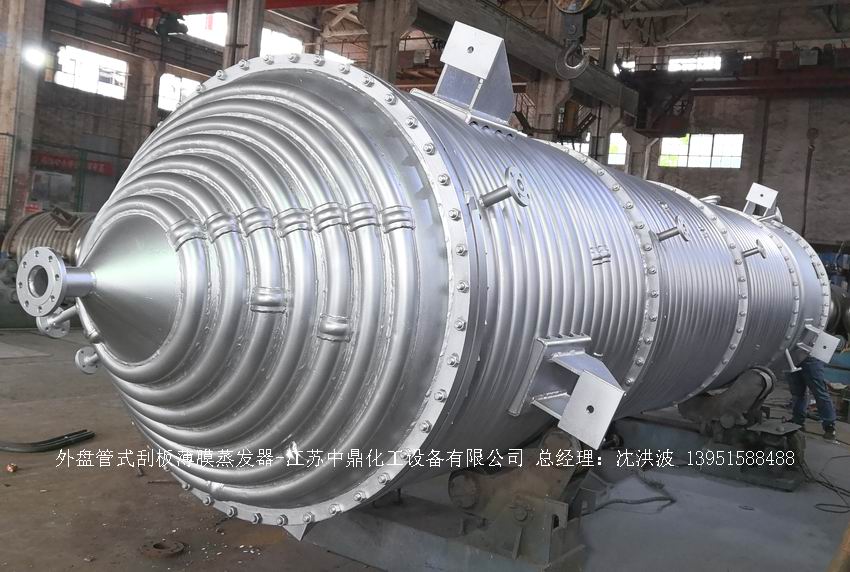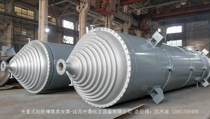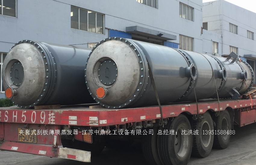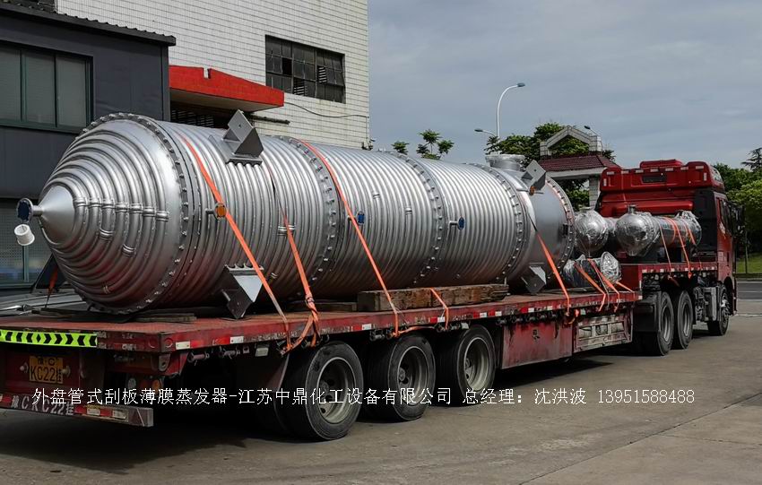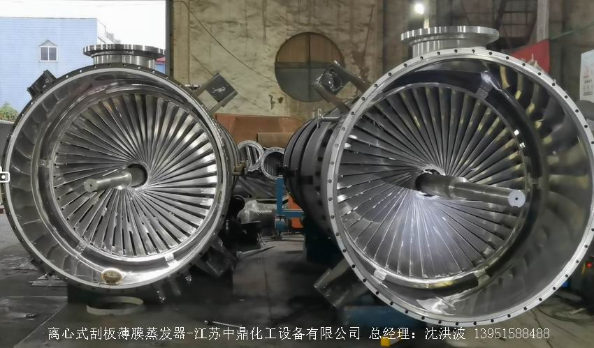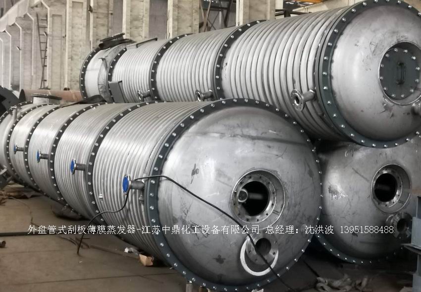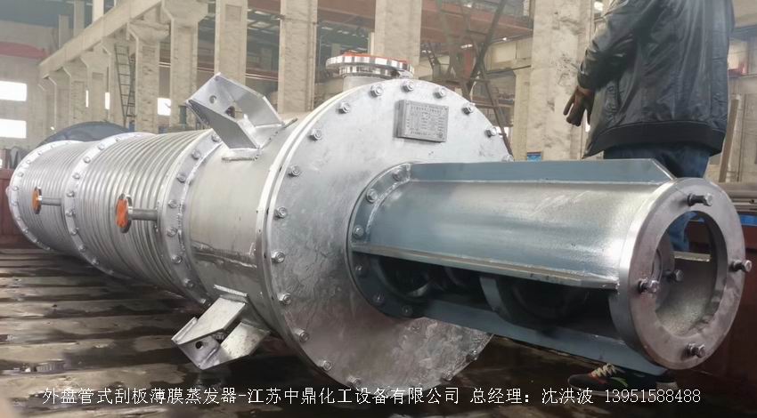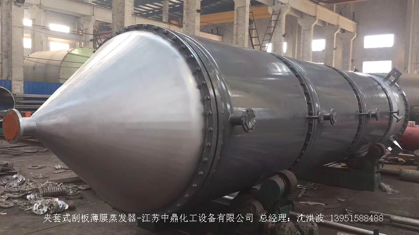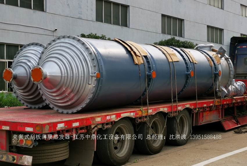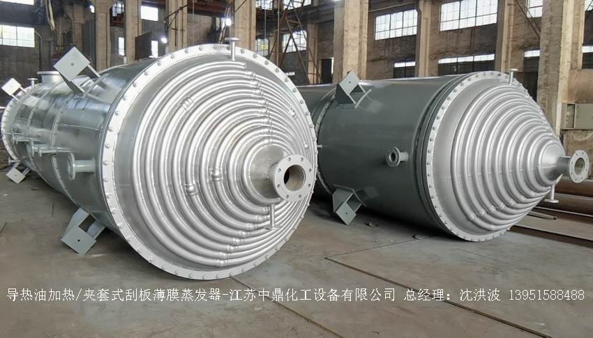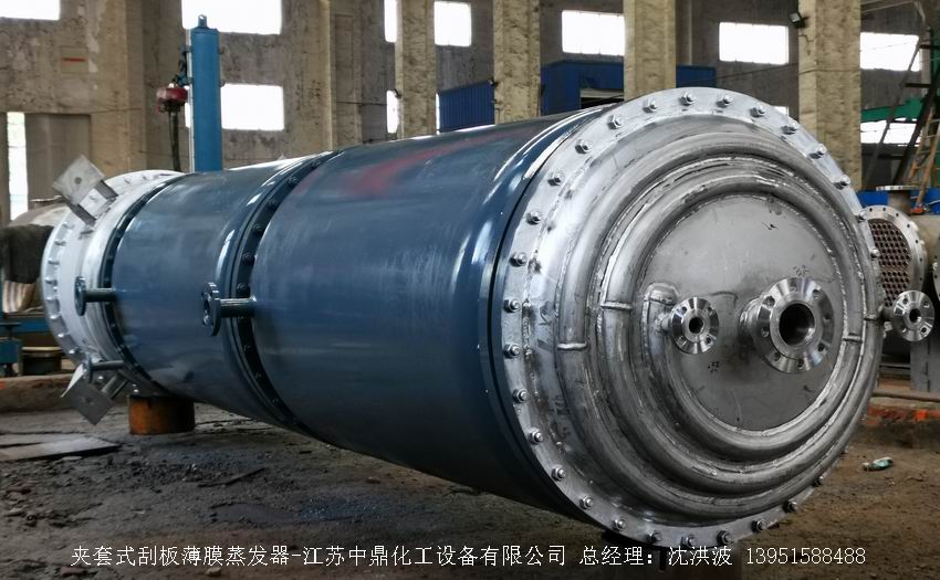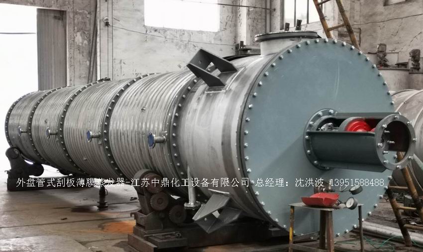 江蘇中鼎化工設備有限公司--離心式刮板薄膜蒸發器主要由加熱外盤半管式夾套(半管夾套內走蒸汽,導熱油,熔鹽或者熱水等循環給蒸發器外壁加溫,通過熱傳導,把蒸發器內壁形成的物料薄膜中的水份蒸發減少,提高物料的濃度百分比。一般設計壓力為0.3mpa~2.5mpa左右,如果是蒸汽溫度一般在180°以下,導熱油溫度一般在280°以下,熔鹽溫度一般在380°以下。刮板也稱刮刀(刮板分為:玻纖四氟刮板、碳纖維四氟刮板、石墨四氟刮板、黃銅刮板、合金鋼等)和傳動裝置:電機(普通變頻電機、防爆變頻電機、高速變頻電機),減速機(擺線針輪減速機、齒輪減速機),機架,軸封系統(單端面機械密封、雙端面機械密封、磁力密封等,如果抽真空必須選用雙端面機械密封或者磁力密封),轉動軸、汽液分離裝置、液體分布器、蒸發器轉子支架、軌道刮板槽、底部軸套等部件組成。外盤半管內或者夾套內通加熱的熱源,刮板裝在可旋轉的軸上,刮板和加熱夾套內壁保持很小間隙,通常為0.5~1.5 mm。在旋轉時通過離心力,使刮板與內壁緊密接觸。把物料從壁上刮下。料液經預熱后由蒸發器上部進料口沿切線方向噴進,通過液體分布器分散盤把液體均勻分布到蒸發器筒體表面,在重力和旋轉刮板的作用下,均勻分布在蒸發器內壁形成下旋薄膜,并在下降過程中不斷被蒸發濃縮,完成液由底部排出,二次蒸汽向上從頂部倉逸出(一般通過真空泵抽出)二次蒸汽再通過汽液分離器、冷凝器處理。在某些場合下,這種蒸發器可將溶液蒸干,在底部直接得到固體產品。這類蒸發器的缺點是結構復雜制造\安裝和維修工作量大。